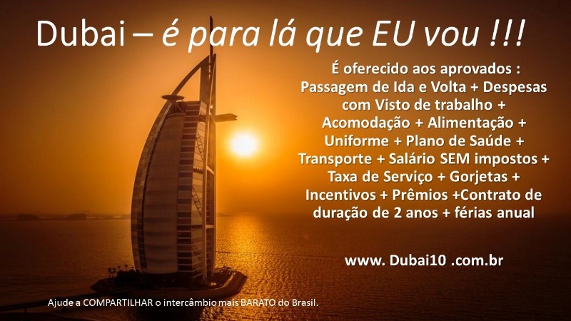 Conseguimos para nossos clientes que são contratados para trabalhar em turismo e hotelaria nos Emirados Árabes e região : contratos de trabalho de 2 a 4 anos + Passagem de Ida e Volta + Despesas com Visto de trabalho + Acomodação + Alimentação + Uniforme + Plano de Saúde + Transporte + Salário SEM impostos + Taxa de Serviço + Gorjetas + Incentivos + Prêmios + férias anual ;